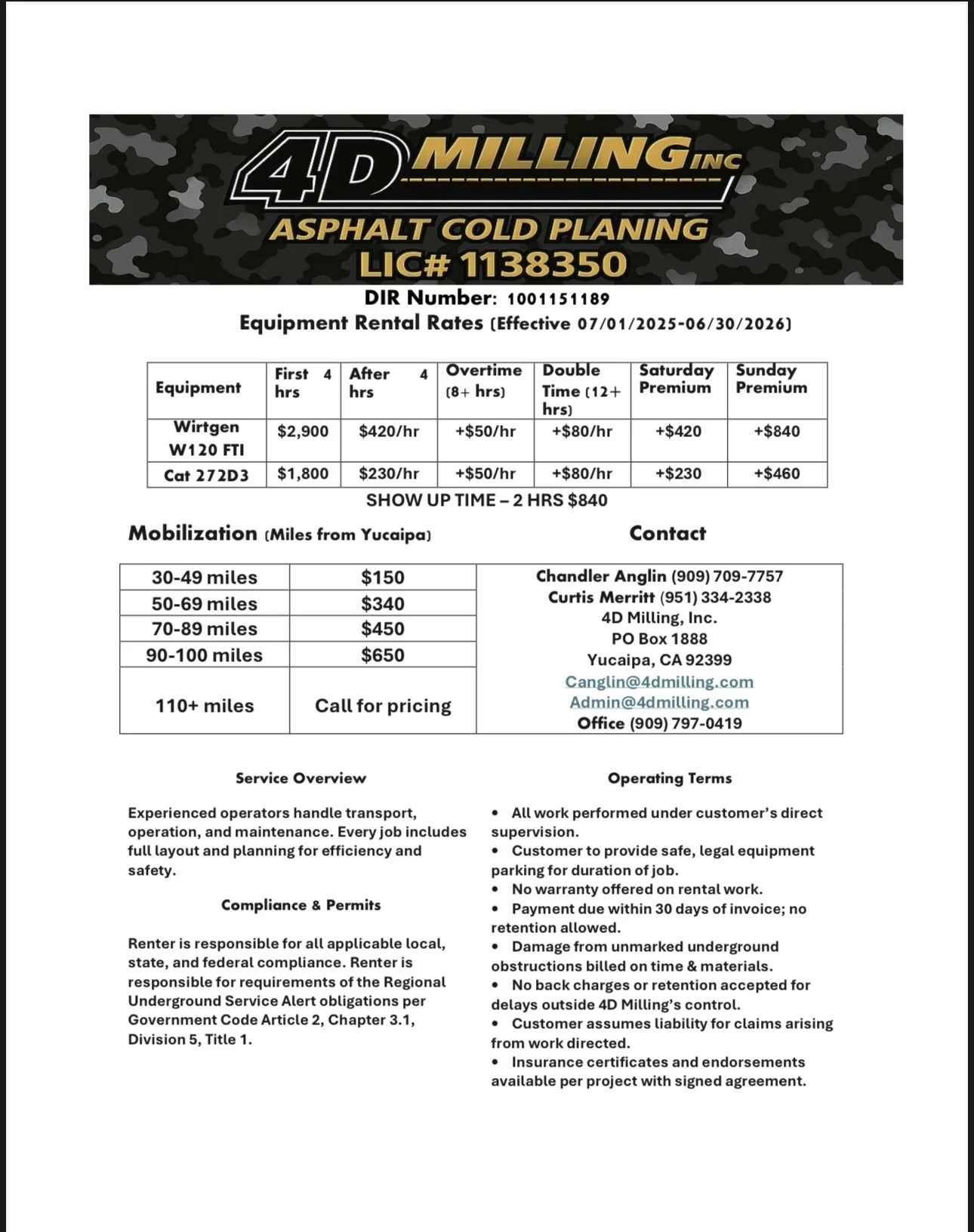 4D Milling Operations: Our service is provided with a very experienced operator who transports, operates, and maintains the machine to give our customers quality and reliability. Before the workday begins, job layout and planning take place to assure a safe and efficient completion.